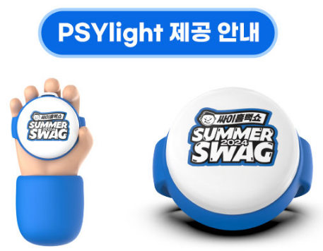 마지막으로 싸이 흠뻑쇼 속초 주최 측에서 모든 관객들에게 PSYlight(LED 너클밴드) 응원도구를 제공할 예정이니 별도의 응원봉을 준비하지 않으셔도 됩니다.