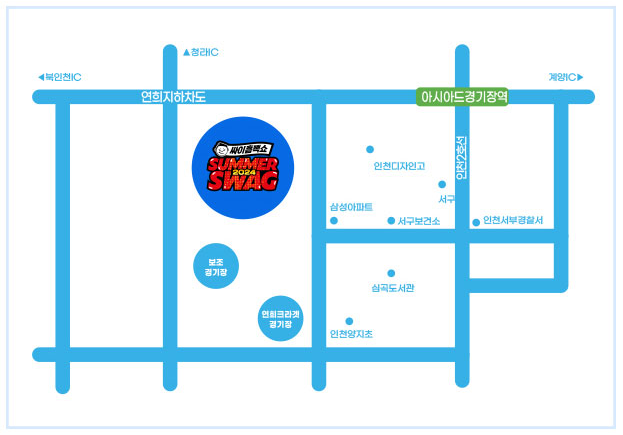 대중교통 : 지하철 서구청역(인천2호선, 도보 20분 소요), 아시아드경기장역(인천2호선, 도보 20분 소요)