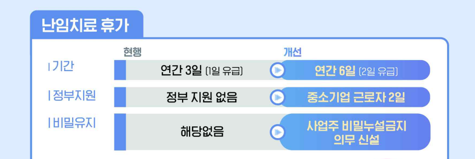 현재 난임 치료를 위한 휴가는 연간 3일로 그중 1일만 유급으로 제공되지만 이번 법 개정으로 6일로 늘어나며 유급 일수도 2일로 증가합니다.