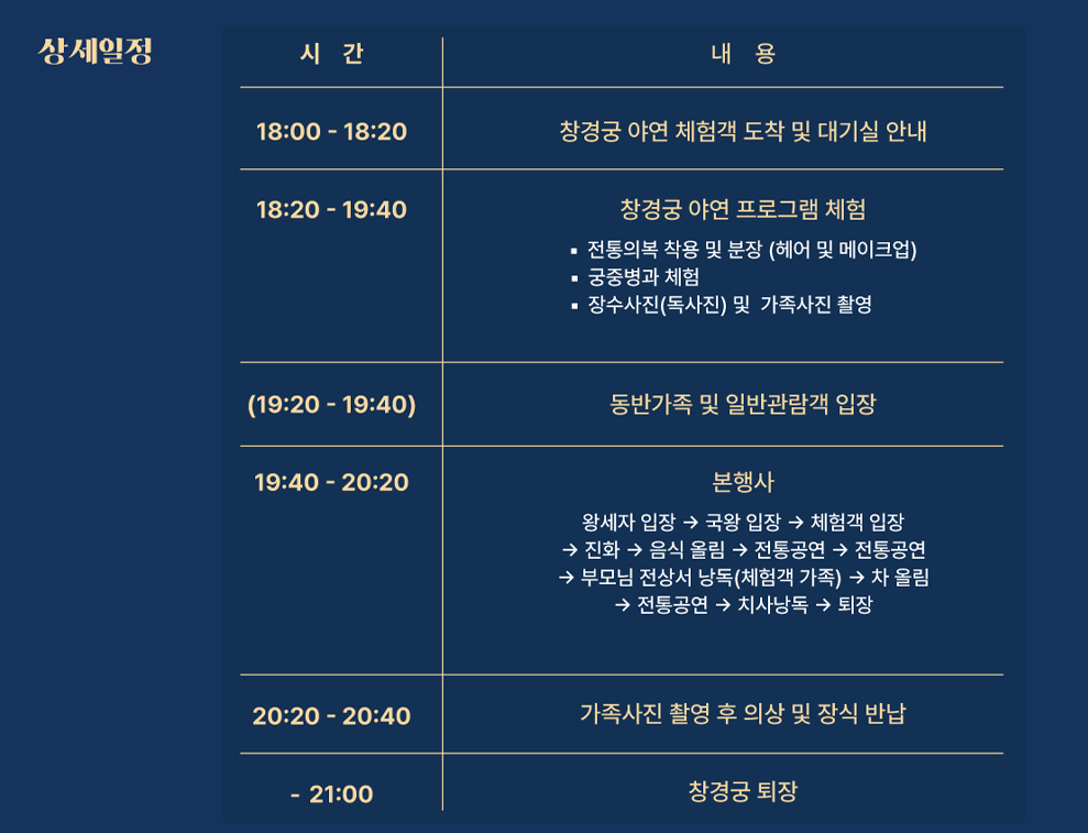 행사 시작 시간 20분 전부터 접수와 창경궁 입장이 가능하고 체험객은 19시 이후에 입장할 경우 사전 안내된 체험 프로그램 참여가 어려울 수 있습니다.