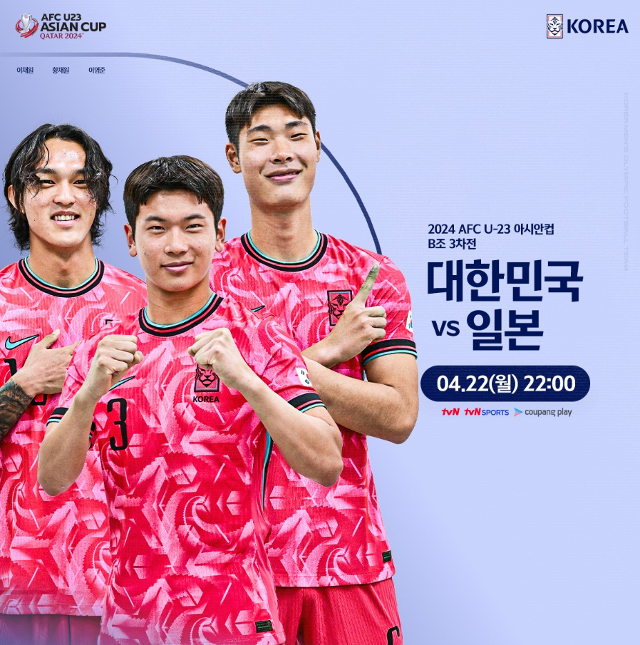 2024 AFC U-23 카타르 아시안컵 대한민국과 일본의 경기 중계방송은 tvN, tvN SPORTS, TVING, 쿠팡플레이에서 시청이 가능합니다. 특히 쿠팡플레이는 유료채널이기 때문에 미리 회원가입을 추천드립니다.