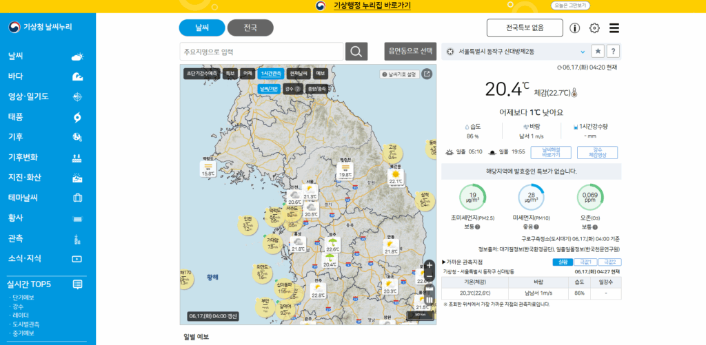 참고로 날씨 예보는 기상청 홈페이지 메인화면에서 날씨지도의 예보를 확인하시기 바랍니다.