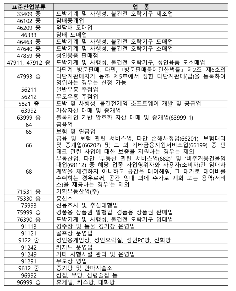 - 사행성 업종 등 보증 제한 업종에 해당하는 사업자