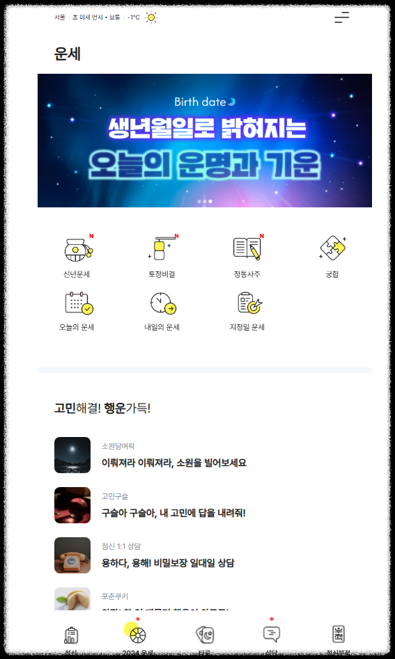 특히 생활 속 나의 운세를 확인하는 생활운세와 나의 운명의 상대를 확인하는 애정 / 궁합 등 다양한 신년운세를 확인할 수 있습니다.