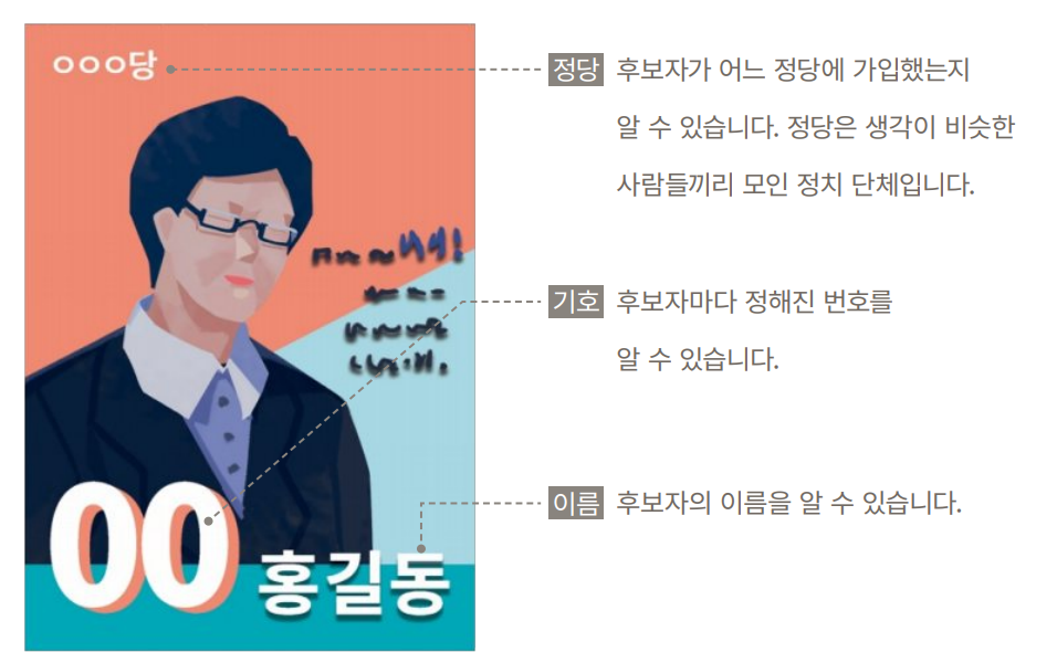 선거벽보는 후보자를 알리기 위해 지정된 장소의 벽에 붙이는 종이로 가입되어 있는 정당, 후보자마다 정해진 번호와 이름을 알 수 있습니다.