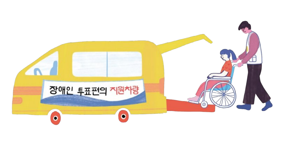 투표를 하고 싶지만 장애가 있어 혼자 투표소에 가기 힘들다면 중증장애인 이동지원 서비스를 신청해 보시기 바랍니다. 중증장애인 이동지원 서비스를 신청하면 선거 날 본인의 집 앞에 휠체어가 들어갈 수 있는 대형 자동차와 봉사직원이 함께 옵니다.