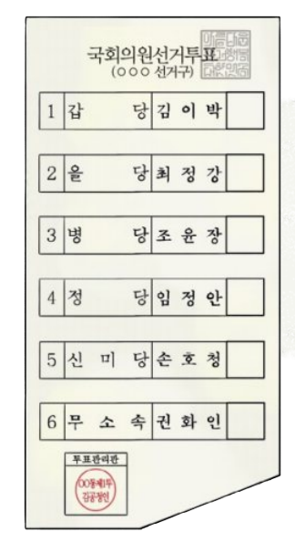 투표사무원이 신분증을 확인한 후 신분증을 돌려주면 흰색과 연두색의 투표용지를 각각 1장씩 줍니다. 흰색 투표용지는 후보자를 뽑는 종이로 내가 뽑고 싶은 후보자 1명에게 투표를 하면 되고 표를 가장 많이 받은 후보자는 지역구 국회의원이 됩니다. 연두색 투표용지는 정당을 뽑는 종이로 표를 가장 많이 받은 정당은 가장 많은 비례대표 국회의원이 정해집니다.