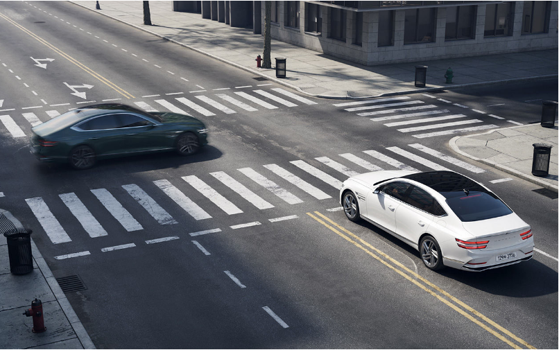 드라이빙 어시스턴스 패키지 II 선택 시 적용되는 옵션으로 교차로에서 직진 시 좌/우측에 다가오는 차량과 충돌 위험이 높아지면 자동으로 제동을 도와줍니다.