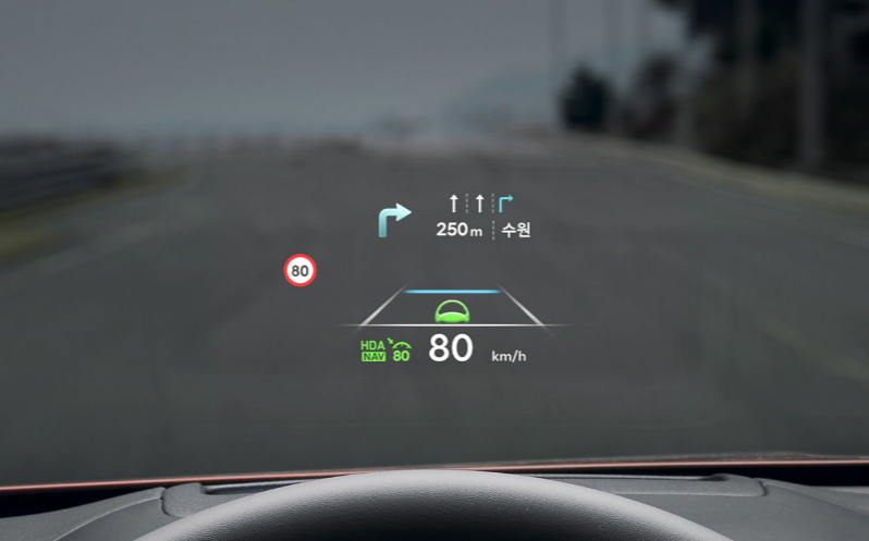 빌트인 캡 패키지 선택시 적용되는 옵션으로 목적지와 경유지, 스마트 크루즈 컨트롤 작동 상태, 전방차량 출발 알림 등의 첨단 운전자 보조 시스템 정보를 일반 내비게이션보다 한층 현실감 있게 전달해 줍니다.